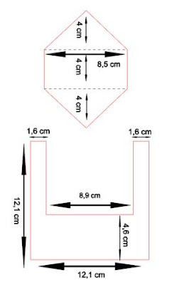 Neem de volgende maten over op karton,  de rode lijnen zijn snijlijnen en de